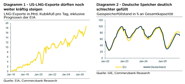 Der europäische Gaspreis ist zu Beginn der Woche unter die Marke von 30 EUR je MWh gefallen und erreichte ein neues Jahrestief bei 29,25 EUR je MWh. Grund dürften die neuerlichen Friedensverhandlungen im Ukraine-Krieg sein. Sollten diese erfolgreich sein, könnten sich Wege für Russland eröffnen, weiter bzw. wieder Gas an Europa zu liefern. Hinzukommt auch die zu Winterbeginn weiterhin allgemein entspannte Angebotslage, insbesondere am globalen LNG-Markt.. --- Europas Gasspeicherstände lagen zu Ende letzter Woche rund 9 Prozentpunkte unter dem Vorjahresniveau.. --- Wie schnell die Stimmung umschlagen kann, zeigte sich bereits im letzten Winter als die Preise im Februar mitunter aufgrund deutlich gefallener Speicherstände, merklich angezogen hatten.. --- Längerfristig dürfte sich die Angebotslage aber sogar noch weiter verbessern und daher zu wieder niedrigeren Preisen beitragen..