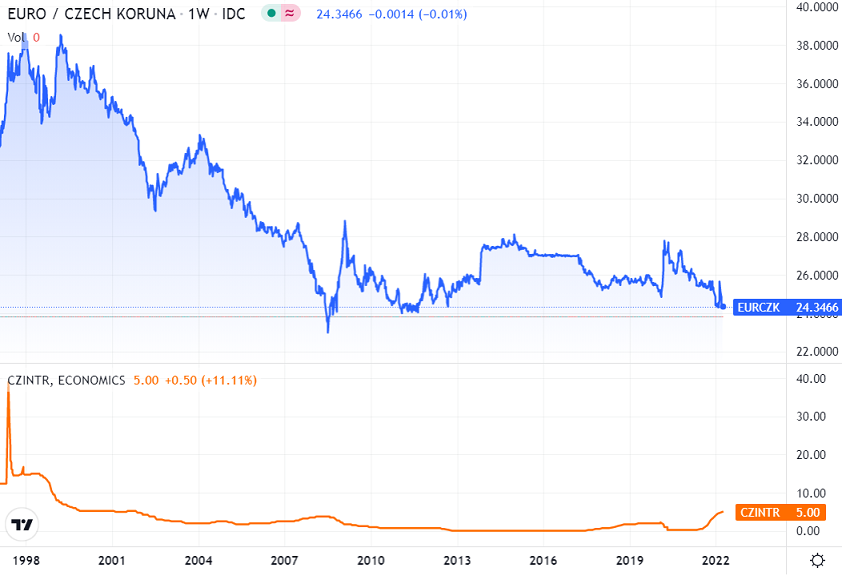 Auf folgender Grafik seht ihr eine Weichwährung und die Tschechische Krone. Gestern erhöhte die Tschechische Notenbank den Leitzins auf 5%. Es wird nicht die letzte Zinserhöhung gewesen sein, denn im Gegensatz zur EZB ist Geldwertstabilität in Tschechien ein ernstgenommener Auftrag (so wie früher bei der Bundesbank übrigens auch).