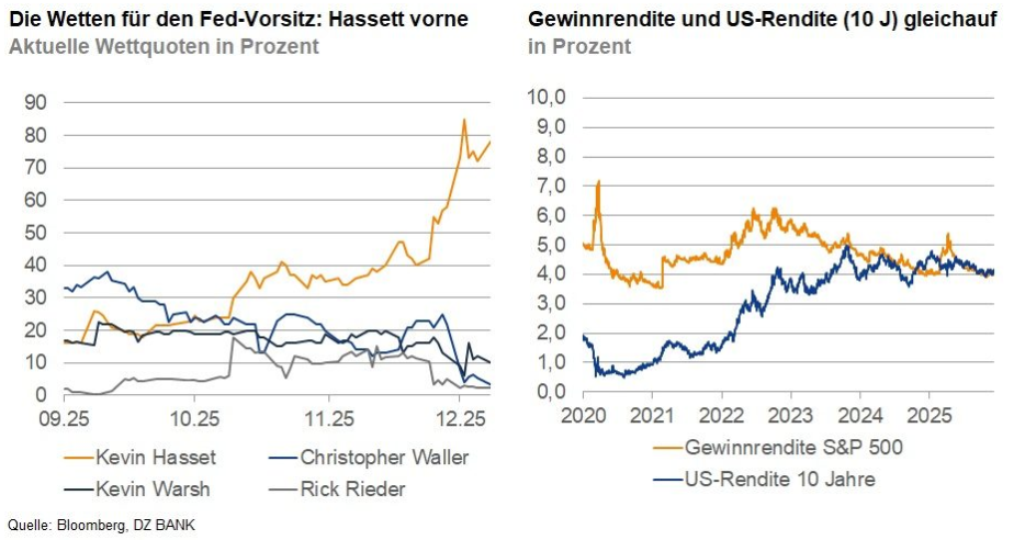 Aktien: Geduldsspiel - Auch in den kommenden Monaten dürfte der Abbau der hohen Bewertung ein Thema bleiben, allerdings gehen wir davon aus, dass im Verlauf von 2026 auch die Konjunktur anzieht und somit bei Aktien Spielraum für moderate Kurszuwächse eröffnet.. --- USA: Fed sollte abwarten, aber tut sie es? --- Die sich abzeichnende Nominierung von Kevin Hassett als Nachfolger von Jerome Powell ist ein zweischneidiges Schwert: Einerseits hat er sich insbesondere durch ausgeprägte Loyalität gegenüber dem Präsidenten für diesen Job qualifiziert – auch um den Preis, sich durch verbale Kehrtwenden in der Öffentlichkeit der Lächerlichkeit preiszugeben. Dies spricht für Druck zu niedrigeren Zinsen..