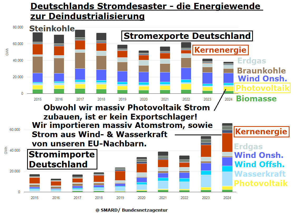 Innerhalb der letzten 10 Jahre sind wir vom Netto-Strom-Exporteur innerhalb der EU zum abhängigen Netto-Strom-Importeur geworden. Der ideologisch durchgesetzte Kernkraftausstieg im April 23 führte ab diesem Jahr zu einem deutlichen Importanstieg von Kernkraftstrom aus Frankreich und Tschechien. Der tschechische Energieversorger CEZ möchte weitere AKWs bauen und macht derzeit gute Geschäfte. Die kumulierte PV-Leistung Betrug Ende 2015 etwa 39 GW in Deutschland und wird bis Ende 2025 wohl auf etwa 110 GW steigen. Unser überschüssiger Photovoltaik-Strom zur Mittagszeit ist kein Exportschlager, im Gegenteil, die Kosten für das Netzengpassmanagement durch die Netzbetreiber, also das Steuern von erneuerbaren Energien und Reservekraftwerken ist stetig steigend und betrug im Jahr 2024 fast 3 Mrd. Euro. Die Kosten für die Förderung von erneuerbaren Energien (früher EEG-Umlage auf den Strompreis, jetzt Bundeshaushalt) gehen durch die Decke, während es im Jahr 2024 noch 10,6 Mrd. Euro waren, werden es 2025 wohl an die 17 Mrd. Euro sein. Die zunehmende Zahl von erneuerbaren Energieproduzenten erfordert auch einen umfangreichen Netzausbau, welcher laut IMK/ Hans-Böckler-Stiftung auf 34 Mrd. Euro jährlich, bzw. auf bis zu 651 Mrd. Euro bis zum Jahr 2045 geschätzt wird. Diese Kosten werden uns über den Strompreis als Netzentgelt in Rechnung gestellt. Da wir uns demnächst auch noch von den "dreckigen" Kohlekraftwerken trennen wollen und wegen der unstetigen Stromproduktion aus erneuerbaren Energien, möchte unsere Wirtschaftsministerin Reiche etwa 40 neue Gaskraftwerke mit 20 GW Leistung ans Netz bringen (einmalige Kosten von etwa 30 Mrd. Euro). Der laufende Betrieb dieser Gaskraftwerke muss natürlich auch noch subventioniert werden. Niemand auf der Welt macht unsere Energiewende nach und wir haben einen der höchsten Strompreise unter den Industrieländern. Wo werden neue KI-Rechenzentren und Produktionsstätten gebaut? Zumeist in Osteuropa, in Deutschland wird ohne Subventionen überhaupt nichts mehr gebaut!