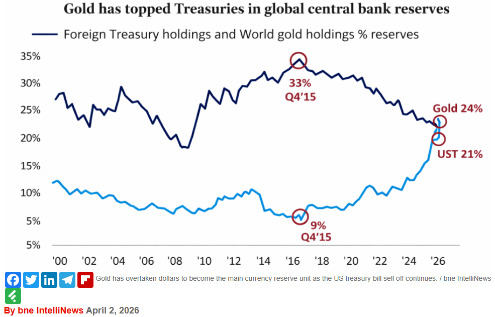 Gold has overtaken US Treasuries as the largest component of global central bank reserves for the first time since the mid-1990s, marking a significant shift in the structure of the international monetary system, Bloomberg reports... --- Gold now accounts for 24% of global central bank reserves, compared with 21% for US government debt, according to the data cited. The change represents a sharp reversal from the final quarter of 2015, when Treasuries made up 33% of reserves and gold just 9%. --- As IntelliNews Lambda reported, China and the leading BRICS countries have started to sell off their treasury bill holdings, selling that started in earnest in 2022 after the US weaponised the dollar by seizing Russia’s central bank reserves but accelerated in April last year after the Trump administration launched the Liberation Day tariffs scheme..