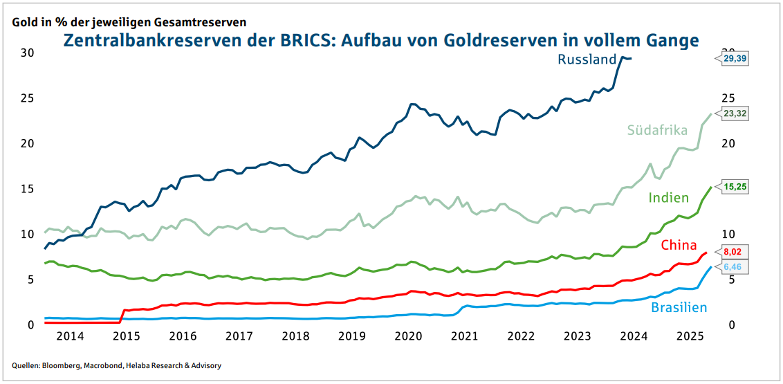 2025 war ein außergewöhnliches Rekordjahr für Gold --- Gold und US-Dollar: traditionell negative und nur zwei Phasen mit positiver Korrelation --- Fed im Zinssenkungsmodus zwar positiv für Gold, aber schon sehr viel vorweggenommen --- Realzins derzeit ohne Einfluss auf Gold --- Silber nun stark überbewertet in Relation zu Gold – Aufholpotenzial für Gold? --- Gold versus S&P 500: Abgehängt! --- Volatilität als Maß für Risikoaversion bleibt trotz geopolitischer Krisen rekordverdächtig niedrig --- Fünf-Jahres-Vergleich: Gold mit deutlichem Vorsprung gegenüber Aktien --- Hohe US-Staatsverschuldung positiv für Gold --- Goldnachfrage: 2025 erstmals wieder starke positive Beiträge vom Finanzmarkt --- Physisches Gold zur Absicherung hat noch Luft nach oben --- Zentralbankreserven der BRICS: Aufbau von Goldreserven in vollem Gange --- US-Dollar bleibt unangefochtene Weltleitwährung, doch Gold nun auf Platz 2 --- Deutsche Goldnachfrage ungewöhnlich niedrig