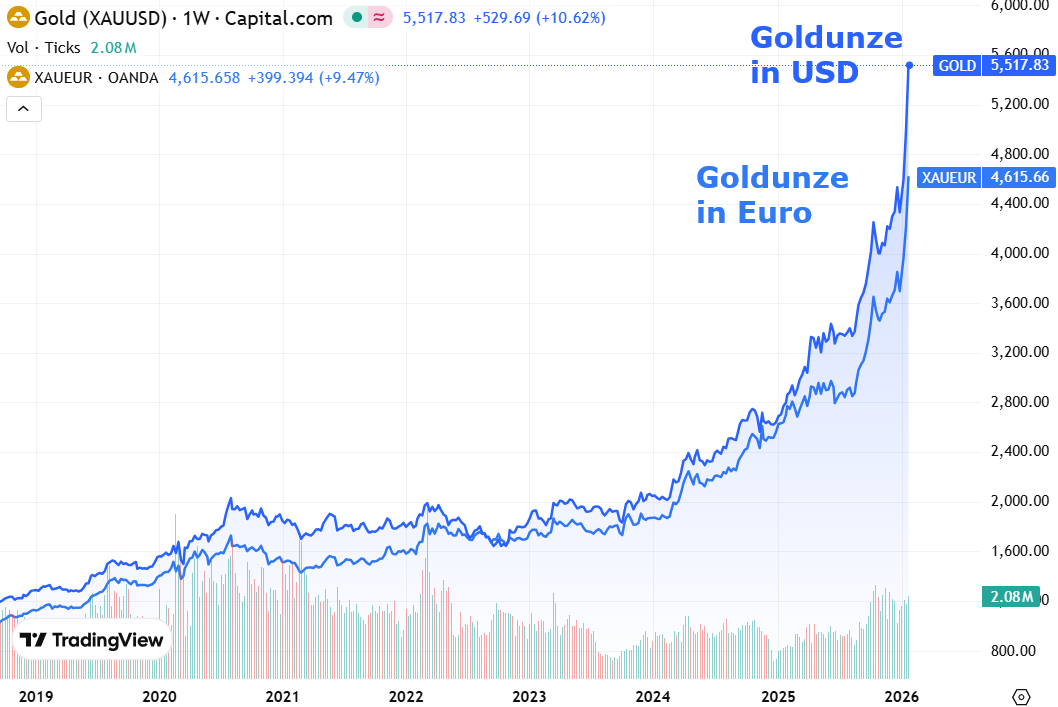 nicht leichtfertig über Bord geworfen werden sollten.. --- Kurzfristig wird die Diskussion um die Nachhaltigkeit der öffentlichen Finanzen noch durch die Möglichkeit eines erneuten Government-Shutdowns befeuert. Wegen der hoch umstrittenen Aktivitäten der Einwanderungsbehörde ICE unter anderem in Minnesota haben die Demokraten gedroht, den Haushalt, der nur temporär verabschiedet worden war und lediglich bis Ende Januar gilt, nicht zu unterstützen.. --- Der zweite noch wichtigere Faktor ist, dass der US-Präsident die Unabhängigkeit der Notenbank in Frage stellt.. --- Die Story ist, dass geopolitisches Chaos, Inflations- und sogar Existenzängste die Suche nach dem definitiven sicheren Hafen anheizen..