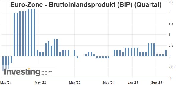 Die Wirtschaft der Euro-Zone ist im dritten Quartal trotz der hartnäckigen Flaute in Deutschland kräftiger gewachsen als bislang angenommen. Das Bruttoinlandsprodukt legte von Juli bis September wegen steigender Konsumausgaben und Investitionen um 0,3 Prozent zum Vorquartal zu, wie das Statistikamt Eurostat am Freitag mitteilte. Eine frühere Schätzung hatte nur ein Plus von 0,2 Prozent ergeben. Im Vorquartal hatte es lediglich zu einem Mini-Plus von 0,1 Prozent gereicht.. --- Das Gefälle innerhalb der Währungsunion bleibt groß. Mit Deutschland stagnierte die größte Volkswirtschaft im dritten Quartal, während die Nummer vier Spanien ein Wachstum von 0,6 Prozent hinlegte. Frankreich schaffte ein Plus von 0,5 Prozent, Italien von 0,1 Prozent..
