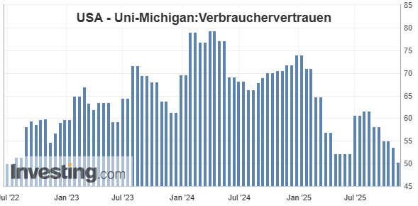 Die Stimmung der US-Verbraucher hat sich im November abgeschwächt. Der an der Universität Michigan berechnete Index für die Verbraucherstimmung in den USA fiel bei der Umfrage zur Monatsmitte auf 50,3. Von Dow Jones Newswires befragte Ökonomen hatten einen Stand von 53,0 erwartet. Bei der Umfrage Ende Oktober lag er bei 53,6.. --- Der Index für die Erwartungen belief sich auf 49,0 (Vormonat: 50,3), der Index für die Einschätzung der aktuellen Lage wurde mit 52,3 (58,6) angegeben. Die Inflationserwartungen der Konsumenten auf Sicht von zwölf Monaten erhöhten sich im Vergleich zum Vormonat auf 4,7 von 4,6 Prozent.. --- Passend dazu schwächelt auch die Börse, die Tech- Konsolidierung ist nicht das Ende vom KI- Hype, aber eine Konsolidierung tut gut und schafft neue Kaufkurse!