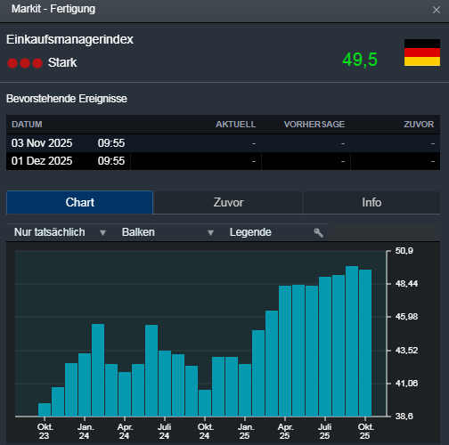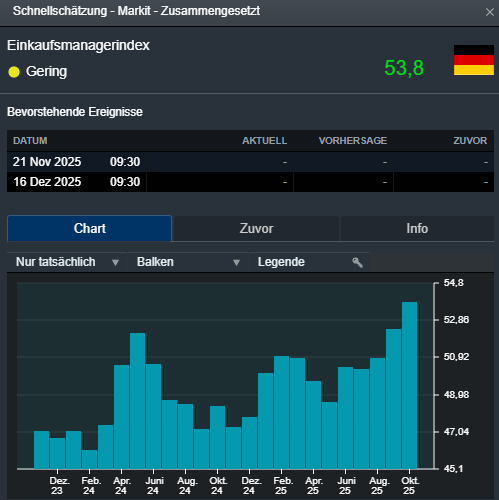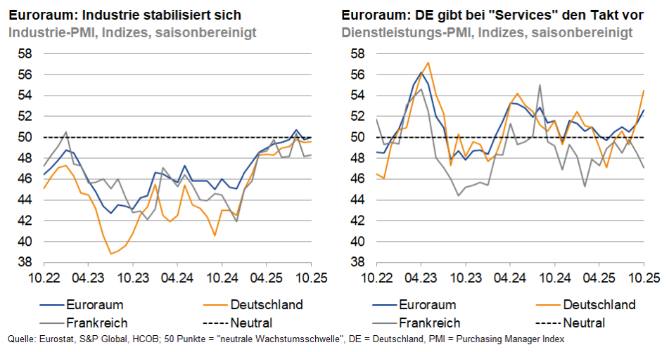 Zum Start ins Schlussquartal signalisieren die Euroraum-PMIs (Einkaufsmanagerindizes S&P Global) eine spürbare Verbesserung der Lage: Der gesamtwirtschaftliche Composite-Index klettert auf 52,2 Punkte. Er wird von den Dienstleistungen und einer erneut zulegenden, wenngleich noch verhaltenen Industrieproduktion getragen. Deutschland liefert den Lichtblick, während Frankreich zurückfällt – politisch und nachfrageseitig belastet. Fazit: Die Erholung bleibt weiterhin dienstleistungsgetrieben, die Industrie stabilisiert sich, steht aber noch auf wackligen Beinen..