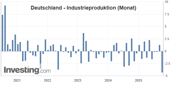 Die europäischen Unternehmen haben ihre Produktion im August spürbar gedrosselt. In der Euro-Zone fiel sie um 1,2 Prozent niedriger aus als im Vormonat, wie das Statistikamt Eurostat am Mittwoch mitteilte. Dies war der stärkste Rückgang seit April. Von der Nachrichtenagentur Reuters befragte Ökonomen hatten sogar mit einem größeren Rückgang von 1,6 Prozent gerechnet, nach einem Anstieg von revidiert 0,5 Prozent im Juli. Das größte Minus in den einzelnen Sparten gab es bei Investitionsgütern wie Maschinen und Anlagen. Hier fuhren die Hersteller ihre Produktion spürbar um 2,2 Prozent herunter. Einzig bei Verbrauchsgütern gab es ein Mini-Plus von 0,1 Prozent. Binnen Jahresfrist stellten alle Unternehmen insgesamt 1,1 Prozent mehr her als im August 2024.. --- Den größten Rückgang hingegen gab es in Deutschland mit 5,2 Prozent, gefolgt von Griechenland mit minus 4,5 Prozent..