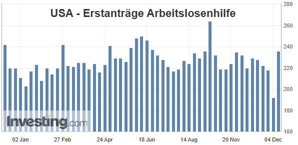 Im Vergleich zur Vorwoche stieg die Zahl der Anträge auf saisonbereinigter Basis um 44.000 auf 236.000, wie das US-Arbeitsministerium in Washington mitteilte. Von Dow Jones Newswires befragte Volkswirte hatten lediglich einen Anstieg auf 223.000 vorhergesagt...
