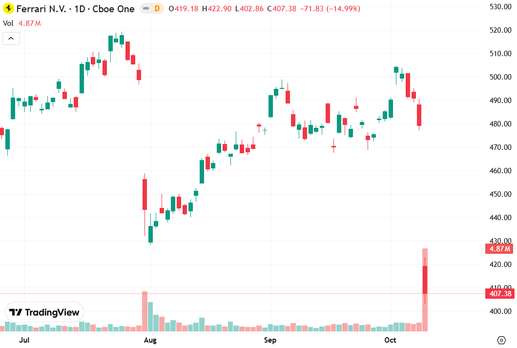 Shares of Ferrari NV crashed 16% in Milan trading, marking the biggest intraday decline since 2016, after the exotic carmaker delivered a cautious long-term outlook that fell short of Wall Street expectations. Analysts, including Tom Narayan's team at RBC Capital Markets, said Ferrari's updated 2030 guidance came in below consensus estimates. The cautious forecast comes as UBS warned last week that softness in U.S. consumer demand has spread from low-income to middle-income buyers.