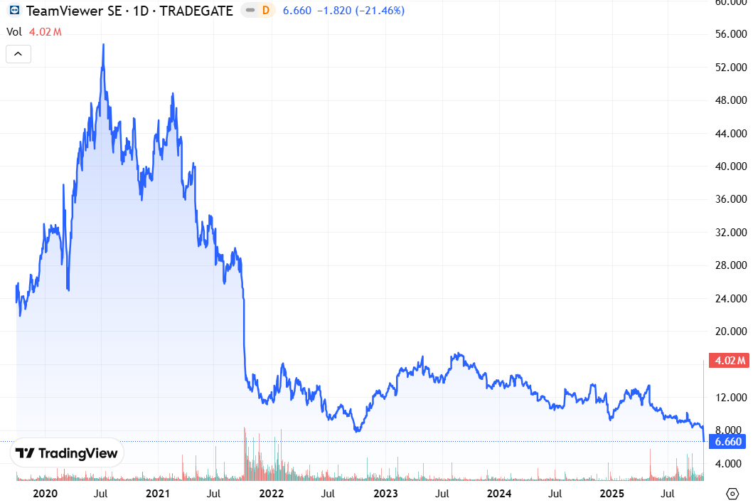 Ein enttäuschender Ausblick hat TeamViewer den zweitgrößten Kurssturz der Firmengeschichte eingebrockt. Die Aktien des Spezialisten für Fernwartungssoftware fielen am Mittwoch zeitweise um fast 25 Prozent auf ein Rekordtief von 6,41 Euro. Wegen des schwächelnden Großkundengeschäfts der Sparte 1E habe er einen Teil der Ziele für dieses und das kommende Jahr gesenkt, sagte TeamViewer-Chef Oliver Steil in einem Interview der Nachrichtenagentur Reuters..