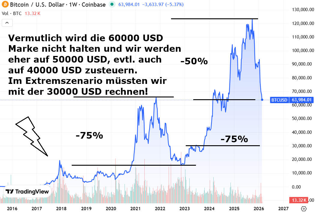 Der Bitcoin zeigt sich in schlechter Verfassung. Glücklich sind nur die Edelmetallbesitzer! Der Mann im Weißen Haus bleibt ein wesentlicher Treiber für die Edelmetalle, viele Notenbanken bauen ihre US-Dollar-Anleihen ab und investieren in Edelmetalle. Das Vertrauen in die Weltleitwährung schwindet und womöglich steht demnächst ein Krieg mit dem Iran an, wenn kein "Deal" gefunden wird. Der Bitcoin kann aber schon seit längerer Zeit nicht mehr von der Unsicherheit profitieren, wie wir es bei den Edelmetallen sehen. Langfristig war der Bitcoin ein gutes Investment, allerdings haben wir auch schon 2021/ 2022 eine Korrektur von 75% beim Bitcoin gesehen und seit Oktober 2025 gab es eine Korrektur von 50%, wobei das Hoch bei fast 124000 USD lag. Bei aktuell 64000 USD scheint noch kein Boden in Sicht zu sein, wir halten es für wahrscheinlich, dass wir die 60000 USD- Marke unterschreiten und die 50000 USD- Marke ansteuern werden. Ob es dann noch tiefer geht, sollte man nicht ausschließen, aber vielleicht ändert sich die Stimmung auch wieder zum Besseren. Focus Online berichtet, dass der größte weltweite Kryptominer Bitdeer alle seine Bitcoins verkauft hat und stattdessen seine Rechenleistung für KI-Anwendungen zur Verfügung stellt. Mit letzteren kann man Geld verdienen, mit dem Bitcoin schürfen kann man offensichtlich derzeit kein Geld verdienen. Ein anderer bekannter Bitcoin- Miner, die Firma Strategy (früher MicroStrategy) hält noch dagegen und kauft weiterhin Bitcoins dazu. Mit letzterer Strategie hat die Firma Anfang Februar einen Quartalsverlust von fast 43 USD vermeldet, bei einem Aktienpreis von etwa 120 USD. Beim Bitcoin- Preis ist noch kein Boden in Sicht und vermutlich wird es erst noch schlimmer, bevor es besser wird. Gut möglich, dass noch mehr Bitcoin- Bestände panikartig auf dem Markt kommen und womöglich stellt Strategy seine Käufe irgendwann ein, dann haben wir eine gute Grundlage für einen Boden! https://www.focus.de/finanzen/boerse/ef3e0c47-386a-4ff4-9a0f-8a18158687a9.html