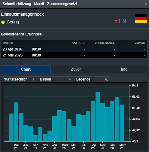 Das Wachstum der deutschen Wirtschaft hat sich im März stärker als erwartet abgeschwächt, während der Kostendruck infolge des Krieges im Nahen Osten sprunghaft gestiegen ist. Der von S&P Global erhobene Sammelindex für die Produktion in der Privatwirtschaft - Industrie und Dienstleister zusammen - verringerte sich auf 51,9 von 53,2 Punkten im Vormonat, wie aus den Daten der ersten Veröffentlichung hervorgeht. Von Dow Jones Newswires befragte Ökonomen hatten nur einen Rückgang auf 52,3 erwartet.. --- Der Einkaufsmanagerindex des verarbeitenden Gewerbes stieg auf 51,7 von 50,9 Punkten im Vormonat. Volkswirte hatten einen Rückgang auf 49,5 erwartet. Der Index für den Servicesektor ging zurück auf 51,2 von 53,5 Punkten. Die Prognose hatte auf einen Rückgang auf 52,5 gelautet..