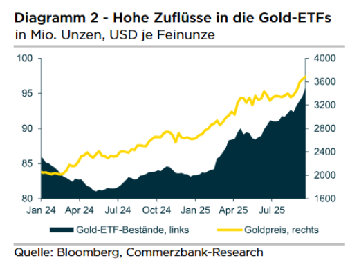 Die harten Fakten dürften die Angebotssorgen am Ölmarkt etwas verringern: Sollte die OPEC-Produktion umfragebasierten Schätzungen zufolge im September abermals deutlich gestiegen sein, dürfte der Ölpreis eher fallen, zumal eine in vielen Ländern wohl verhaltene Unternehmensstimmung wenig Optimismus bezüglich der Nachfrage aufkommen lässt. Das dürfte auch den Höhenflug am Kupfermarkt ausbremsen. Am Goldmarkt dagegen sehen wir die Preise gut unterstützt, weil noch viele Investoren auf den Zug aufspringen..