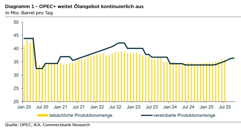 Die acht OPEC+-Länder mit freiwilligen Produktionskürzungen haben am Sonntag bei einer virtuellen Sitzung entschieden, die Ölproduktion im Oktober um weitere 137 Tsd. Barrel pro Tag zu erhöhen.. --- Das ohnehin schon beträchtliche Überangebot am Ölmarkt von schätzungsweise mehr als 2 Mio. Barrel pro Tag im vierten Quartal 2025 und ersten Halbjahr 2026 droht durch die fortgesetzte Ausweitung der OPEC+-Produktion noch größer auszufallen und zu einem weiteren Lageraufbau zu führen.. --- Im Fokus steht nicht mehr primär die Stabilisierung des Ölmarktes und des Ölpreises, sondern die Rückgewinnung von Marktanteilen.. --- Dass die Ölpreise bislang nicht stärker gefallen sind, dürfte vor allem auf die zuletzt gestiegenen Angebotsrisiken zurückzuführen sein.. --- Wir revidieren aufgrund der gestiegenen Abwärtsrisiken unsere Ölpreisprognose für Brent im kommenden Jahr auf 65 USD je Barrel nach unten. Bislang lag die Prognose bei 70 USD.. --- China baut Rohölvorräte auf und absorbiert damit Überangebot am Ölmarkt..