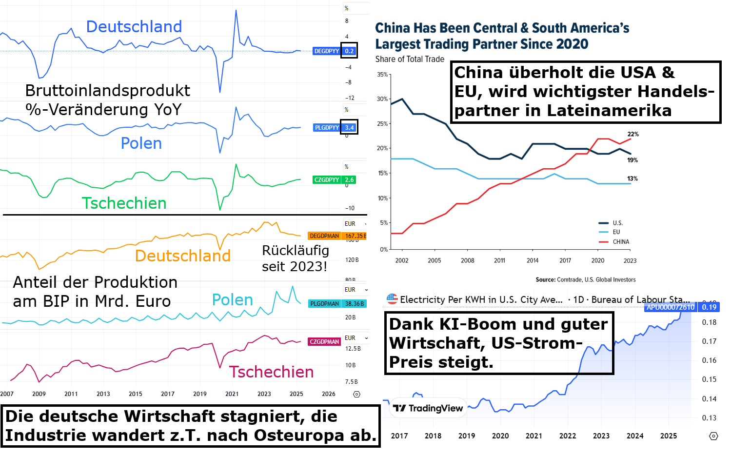 Der Goldpreis konsolidierte kurz und heftig, der positive Ausblick für Gold bleibt allerdings bestehen. Bei 3900 bis 3800 USD findet der Goldpreis eine gute Unterstützung und neue Käufer. Die US-Quartalssaison läuft gut, bisher haben 80% der Unternehmen ihre Gewinnschätzungen übertroffen, insbesondere Industriewerte stechen positiv hervor. Trump möchte mithilfe von Zöllen die US-Produktion stärken und Arbeitsplätze zurück ins Land holen. Dieser Plan geht durchaus auf, wobei dadurch die US-Inflationsrate nach oben getrieben wird. Auch die heimische Industrie dreht an der Preisschraube und somit bleibt mehr Gewinn übrig. Der KI-Boom ist kein Strohfeuer und wir stehen erst am Anfang dieser Revolution, Aktien wie Nvidia, Palantir oder Microsoft (beteiligt an OpenAI) gehören ins Langfristdepot und sollten bei Kursschwäche eingesammelt werden. Die US-Wirtschaft wächst, zusammen mit dem Neubau von KI-Rechenzentren, benötigt die USA signifikant mehr Strom. Dies lässt den US-Strompreis steigen, alte Atomkraftwerke werden wieder in Betrieb genommen und neue gebaut. Neben den KI-Aktien sind die US-Versorger die Gewinner dieser Entwicklung. In Deutschland steigt auch der Strompreis, nicht weil die Wirtschaft wächst, sondern weil wir im Zuge der Energiewende im Klimawandelwahn gefangen sind. Unsere stillgelegten CO2- neutralen Atomkraftwerke werden abgerissen. Ein weltweit einmaliger Vorgang, der rationell nicht mehr zu erklären ist. Unsere Industrie wandert nach Asien und Osteuropa ab. Das BIP in Polen wächst derzeit mit 3,4% zum Vorjahr (auch dank Rüstung). Ein Profiteur dieser Entwicklung ist die polnische Bank Pekau (Bank Polska Kasa) mit fast 10% Dividende. Eine günstige Bank mit soliden Wachstumsraten, bei der wir Anfang der Woche eingestiegen sind. Ebenso eingestiegen sind wir beim chinesischen Elektroautobauer BYD. Obwohl es im chinesischen Markt Überkapazitäten und Preiskämpfe gibt (welche der Branchenprimus gut überstehen sollte), wird BYD in Europa und Lateinamerika signifikant wachsen!