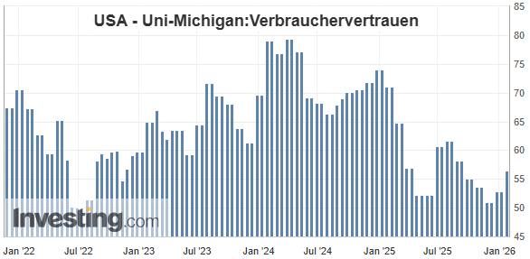Die Stimmung der US-Verbraucher hat sich im Dezember aufgehellt. Der an der Universität Michigan berechnete Index für die Verbraucherstimmung in den USA stieg bei der Umfrage am Monatsende auf 55,4 von 52,9 Ende Dezember. Von Dow Jones Newswires befragte Ökonomen hatten einen Stand von 54,0 erwartet. Bei der ersten Umfrage Mitte des Monats lag er bei 54,0.. --- Die Inflationserwartungen der Konsumenten auf Sicht von zwölf Monaten verringerten sich im Vergleich zum Vormonat auf 4,0 von 4,2 Prozent. Auf Sicht von fünf Jahren legten sie zu auf 3,3 von 3,2 Prozent..