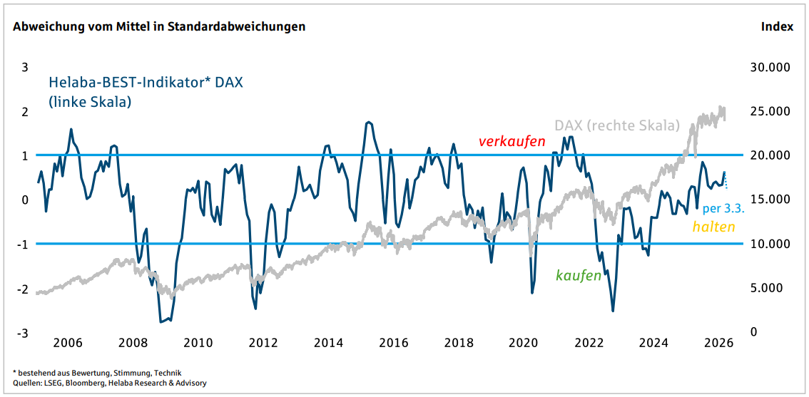 Helaba-BEST-Indikator wenig verändert im neutralen Bereich: Halten! --- DAX-Bewertung aktuell wieder in den fairen Bereich zurückgekehrt --- Konjunkturstimmung vor Iran-Krieg stabilisiert --- Anlegerstimmung setzt Sägezahnmuster fort --- Technikindikator trotz jüngster Korrektur im neutralen Bereich..