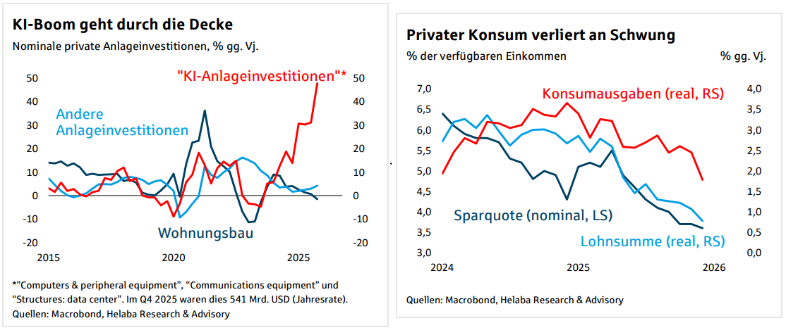 haben wir, verglichen mit unserem Jahresausblick vom November 2025, die Wachstumsprognose für das laufende Jahr leicht auf 2,3 % angehoben (bisher: 2 %), nach 2,2 % im Vorjahr.. --- Mittelfristig trübere Aussichten: Mittlerweile stellt der KI-Sektor konjunkturell primär ein Abwärtsrisiko dar..