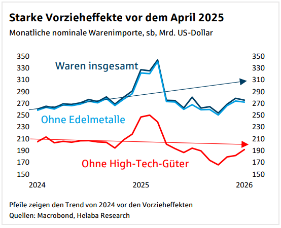 USA: Ein Jahr „Liberation Day“ – ein Misserfolg auf der ganzen Linie. Die Handelspolitik Donald Trumps hat an den Finanzmärkten und in der Realwirtschaft viel Schaden angerichtet, ohne die erklärten Ziele zu erreichen: Die staatlichen Mehreinnahmen werden derzeit zurückgefordert, die angestrebte Reduktion der Importe blieb aus. Dass die Maßnahmen am Ende nennenswerte Impulse für Investitionen oder Arbeitsplätze gesetzt haben, erscheint höchst fraglich.. --- Aktien: Geopolitik dominiert Kurse. Zuletzt hat sich der Helaba-BEST-Indikator klar in Richtung „Kaufzone“ bewegt, allerdings noch kein Signal generiert. Das Chance-Risiko-Verhältnis hat sich inzwischen verbessert. Kurzfristige Erholungsversuche werden angesichts pessimistischer Stimmungsindikatoren wahrscheinlicher. Die bestenfalls als angemessen zu bezeichnende Bewertung eröffnet allerdings derzeit wenig Kursspielraum nach oben. Wir bekräftigen daher unsere Halten-Empfehlung für Aktien..