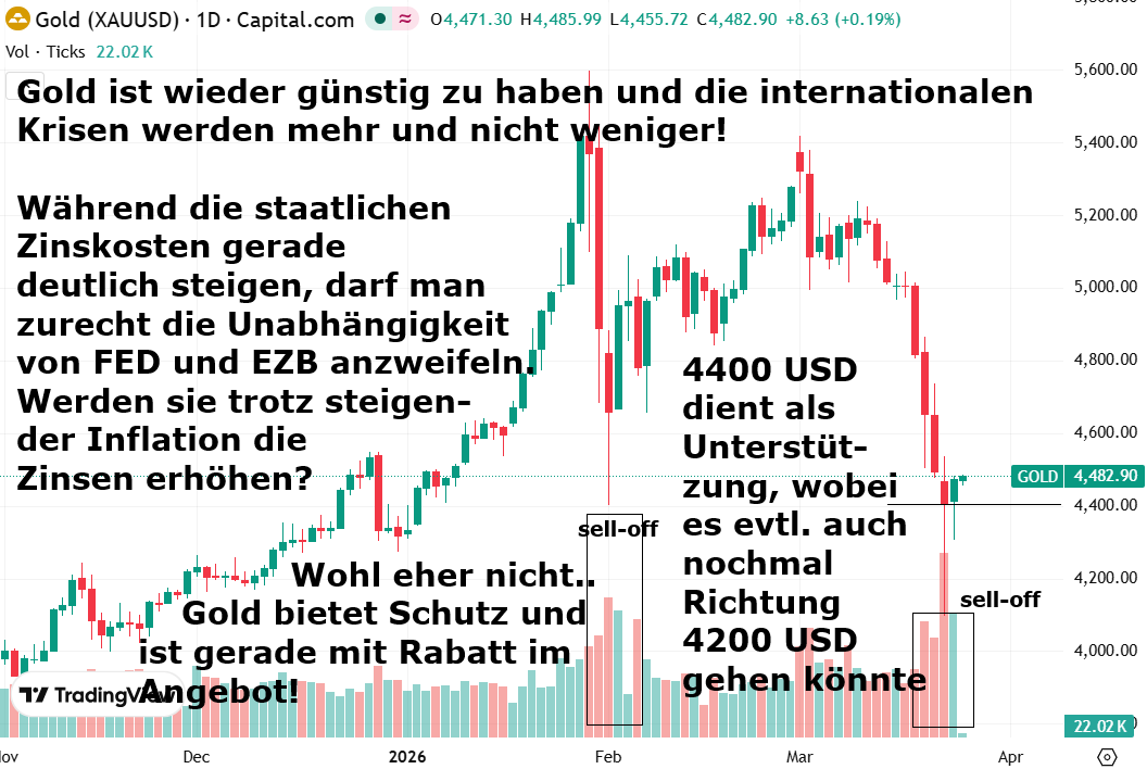 Gold ist zusammen mit den Aktienmärkten zum Beginn des Iran-Krieges deutlich unter Druck geraten. In Kriegszeiten schlichten Anleger gerne in USD um und zuletzt wurden auch Gold-ETFs massiv verkauft, wobei Gold die letzten zwei Jahre eine herausragende Performance zu verzeichnen hatte. Möglicherweise mussten zahlreiche Anleger auch neue Sicherheiten für abstürzende (KI-) Aktien an ihren Broker liefern und hierfür könnten Gold- Positionen mit Gewinn liquidiert worden sein. Ein weiterer Grund für den Gold- Absturz: Der Mittlere Osten und insbesondere Dubai ist eine bedeutende Region für den Goldhandel. Der Krieg vor der eigenen Haustür dürfte nicht ohne Auswirkung auf die lokale Goldnachfrage bleiben. Die privaten Haushalte in den Ländern des Mittleren Ostens kauften im vergangenen Jahr laut Daten des WGC gut 270 Tonnen Gold in Form von Schmuck, Barren und Münzen. Das entsprach einem Anteil von 10% an der weltweiten Nachfrage und übertraf die jeweilige Nachfrage in den USA und in Europa. Aufgeschoben bedeutet allerdings nicht aufgehoben! Das in nächster Zeit die Nachfrage nach Gold im Nahen Osten eher wieder steigen als fallen sollte, dürfte der unsicheren Lage und dem vergünstigten Preis von 5400 USD auf 4400 USD geschuldet sein. Vermutlich werden jetzt auch einige Notenbanken insb. aus China und Indien eher wieder verstärkt bei Gold zugreifen. Der Inflationsgeist ist gerade wieder aus seiner Flasche ausgebrochen und ob die FED/ EZB die Inflation nachhaltig bekämpfen werden, darf man bezweifeln! Gold bietet Schutz gegen Inflation, insb. wenn die Aktienmärkte schwächeln und der KI-Hype an Schwung verliert, schauen sich die Anleger nach Alternativen um. Neben Gold bietet der Bitcoin auch eine gute charttechnische Lage an. Für den langfristigen Anleger dürften beide Assetklassen attraktiv sein, wobei wir Gold den Vorzug geben. p.s. Sehr zu empfehlen ist das Interview von Cash mit Jörg Krämer: https://www.cash.ch/news/top-news/die-usa-haben-nicht-ohne-grund-negativzinsen-immer-gemieden-921875