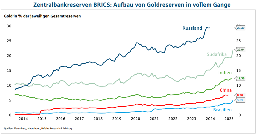 Goldrally läuft und läuft und läuft und.. --- Geopolitische Unwägbarkeiten seit 2014 ein Treiber für Gold --- US-Dollar aktuell mit geringeren Impulsen für Gold --- Fed im Zinssenkungsmodus zwar positiv für Gold, aber schon sehr viel vorweggenommen --- Realzins derzeit ohne Einfluss auf Gold --- Frankreichs Schuldendilemma befördert Gold in Eurorechnung --- Erzwingt Frankreich eine Richtungsänderung der EZB? --- Silber im Windschatten von Gold mit neuem Allzeithoch ebenfalls auf Rekordjagd --- Gold- versus S&P 500-Performance: Abgehängt! --- Volatilität als Maß für Risikoaversion bleibt rekordverdächtig niedrig --- Fünf-Jahres-Vergleich: Gold mit deutlichem Vorsprung gegenüber Aktien --- Hohe US-Staatsverschuldung positiv für Gold --- Goldnachfrage: 2025 erstmals wieder positive Beiträge vom Finanzmarkt --- Physisches Gold zur Absicherung hat noch deutlich Luft nach oben --- Zentralbankreserven BRICS: Aufbau von Goldreserven in vollem Gange --- Deutsche Goldnachfrage ungewöhnlich niedrig..